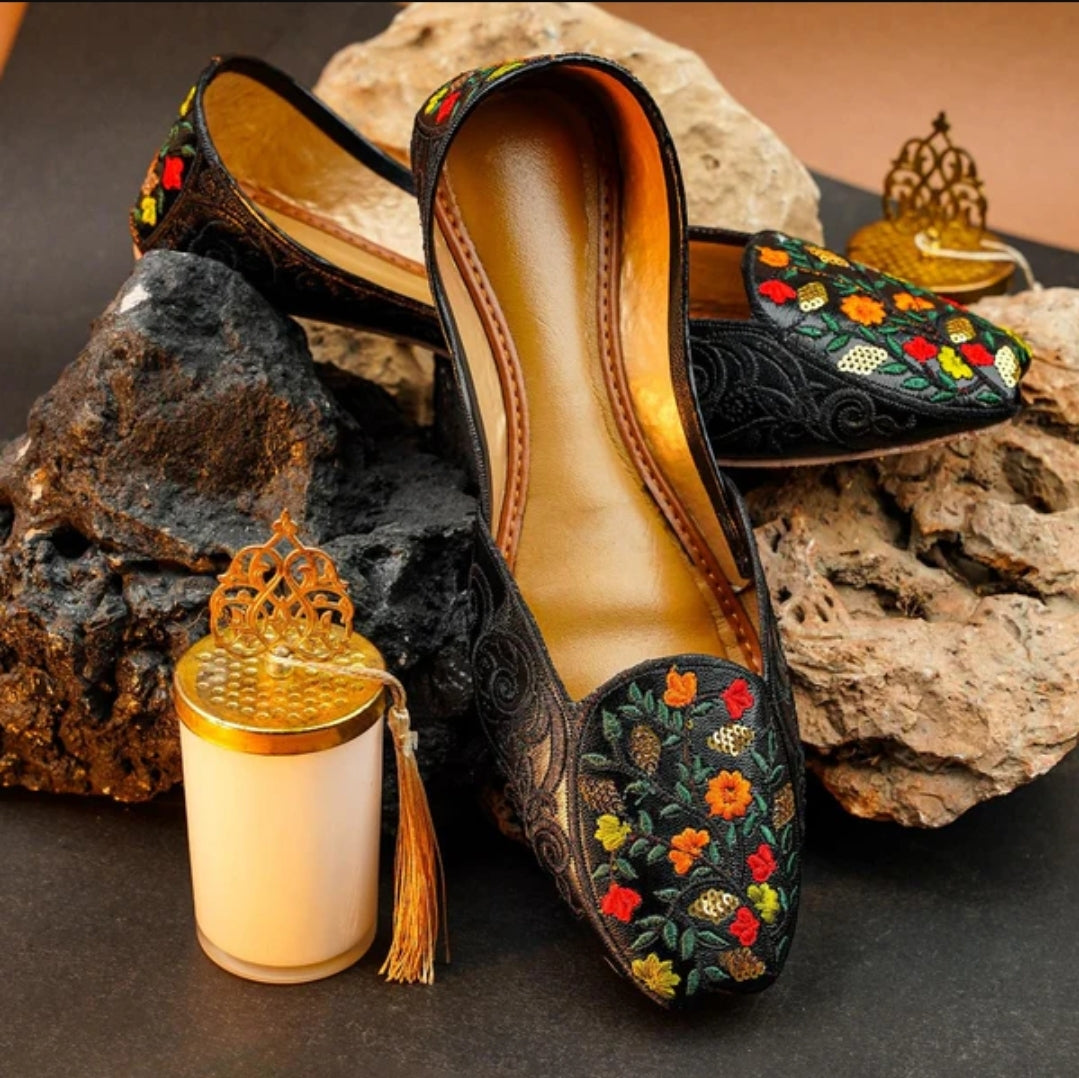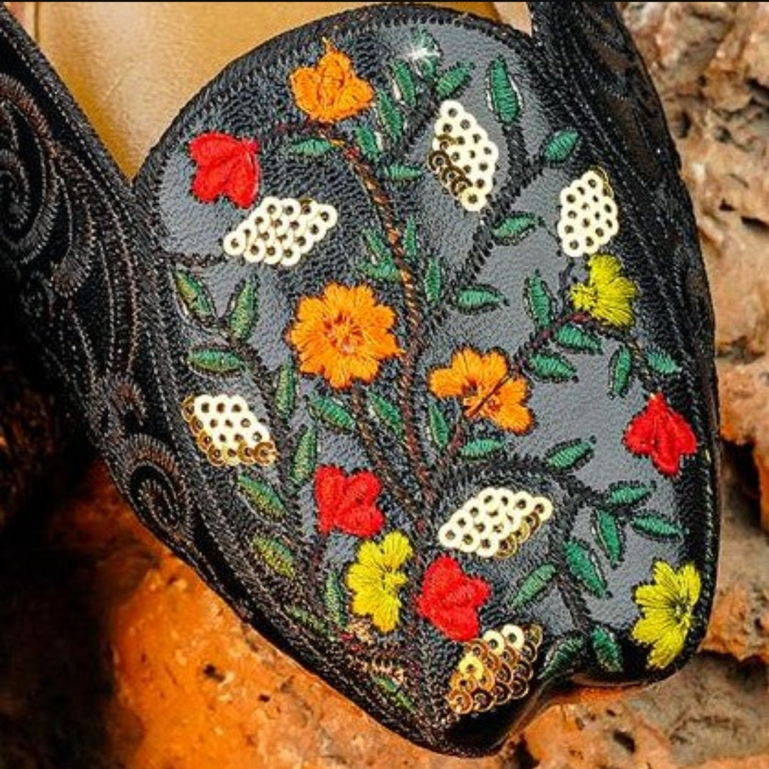 - Deep black base accented by vibrant floral embroidery in warm tones