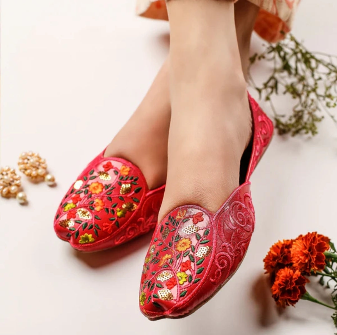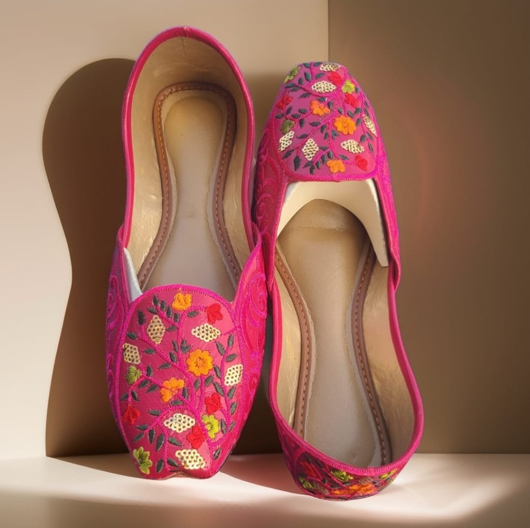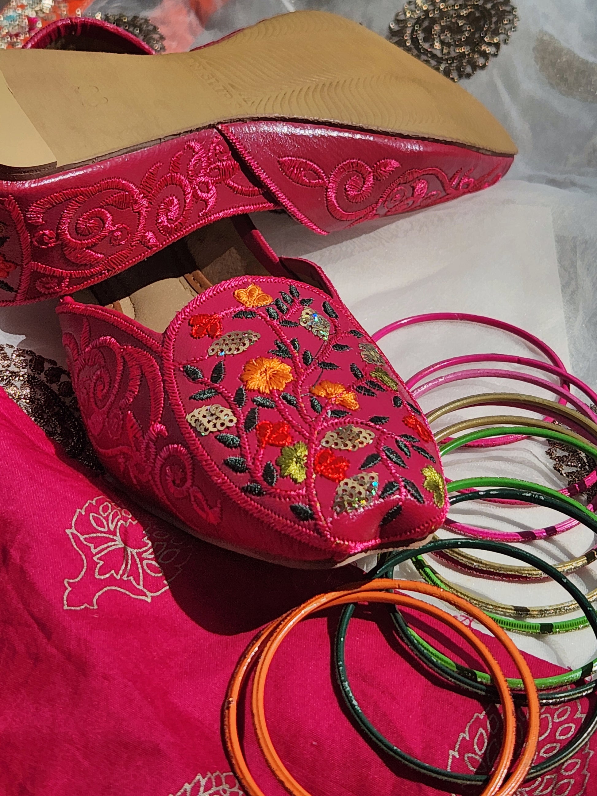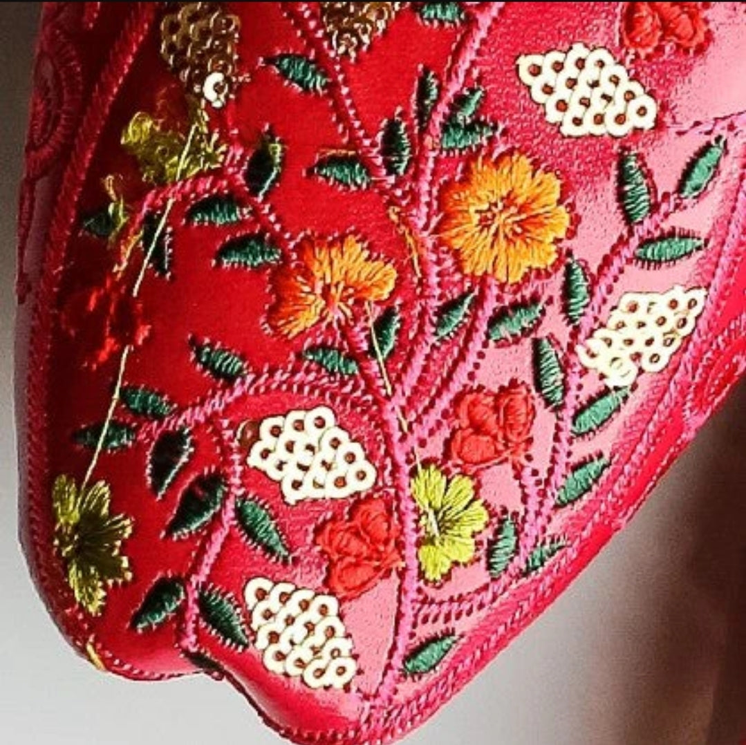 - Rich pink base with intricate floral embroidery in warm tones